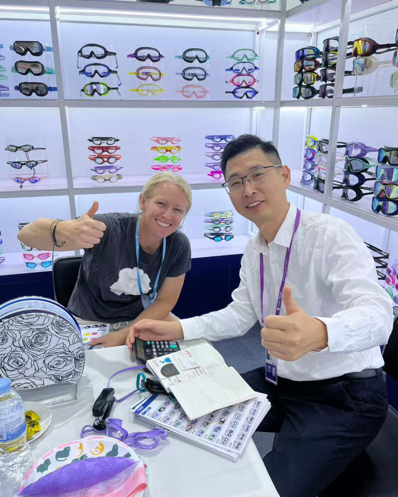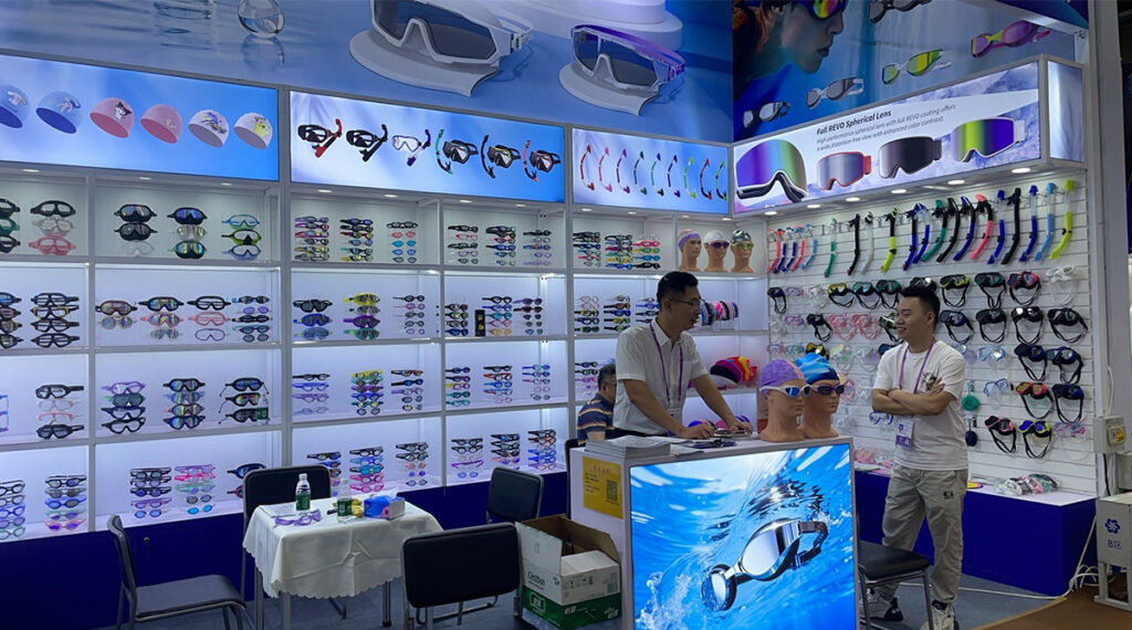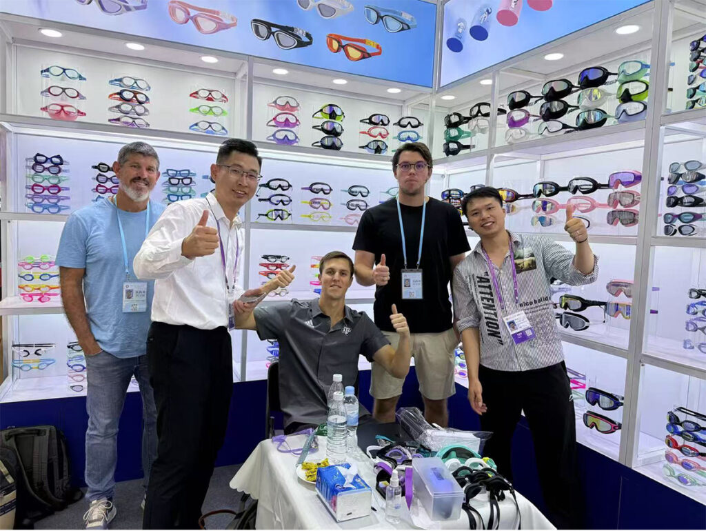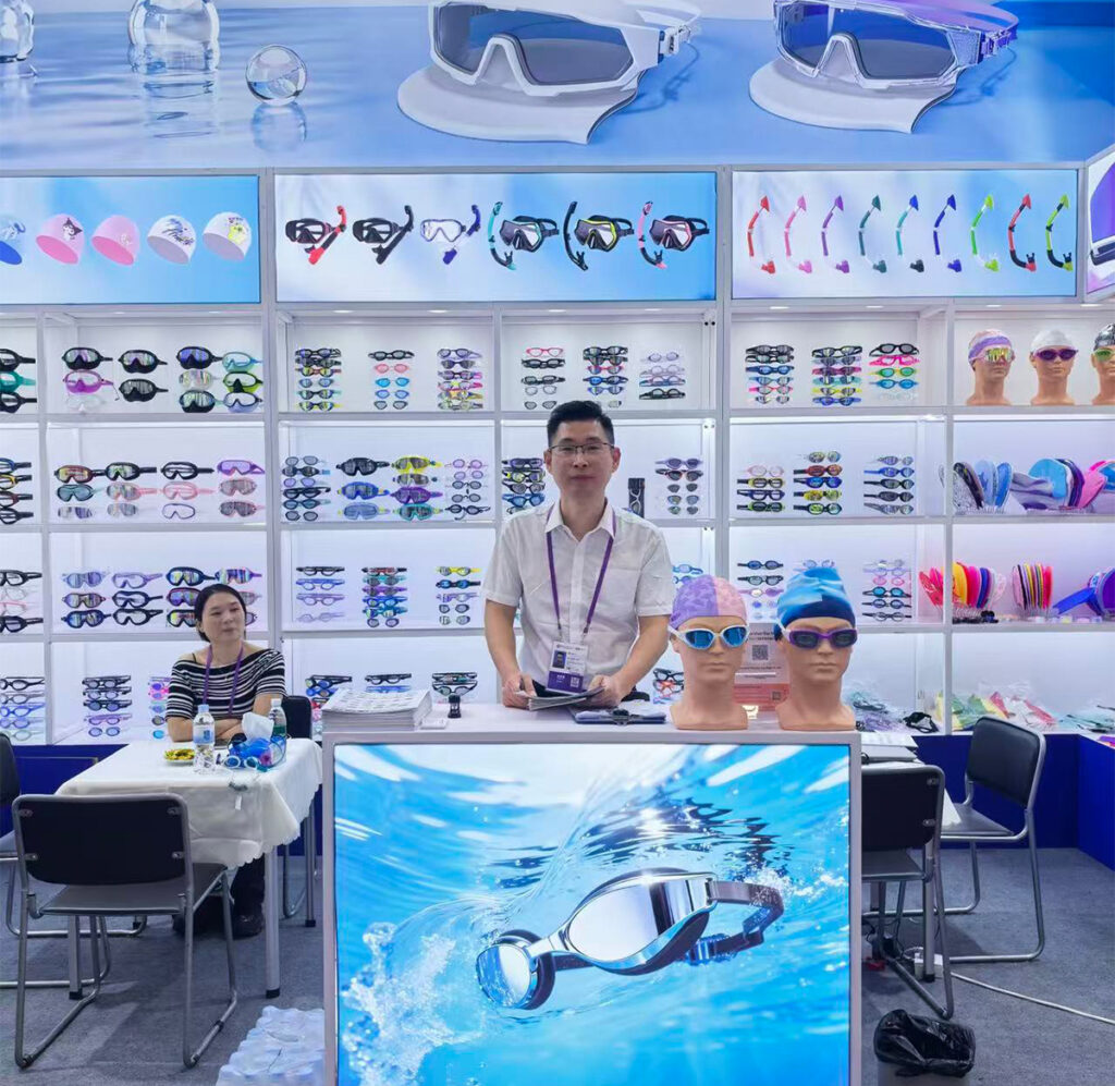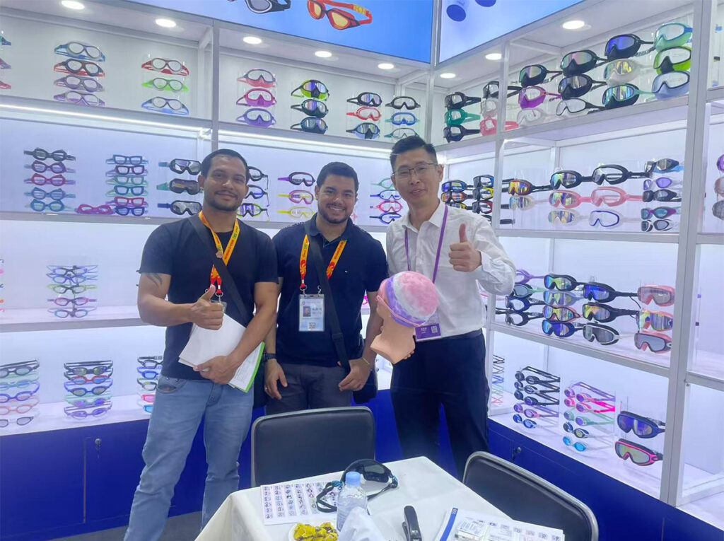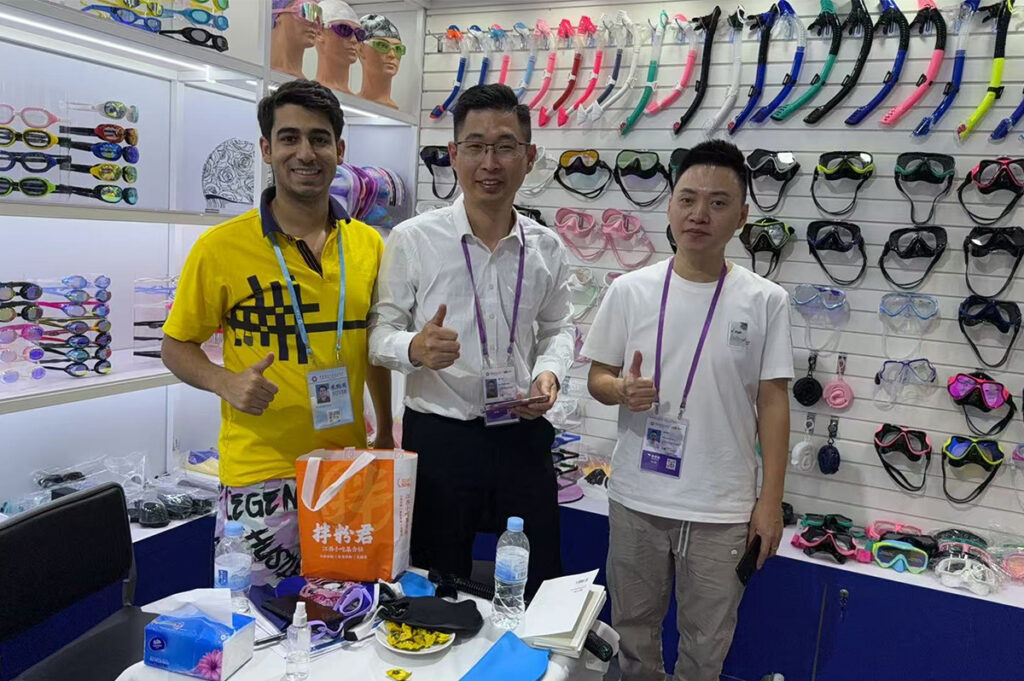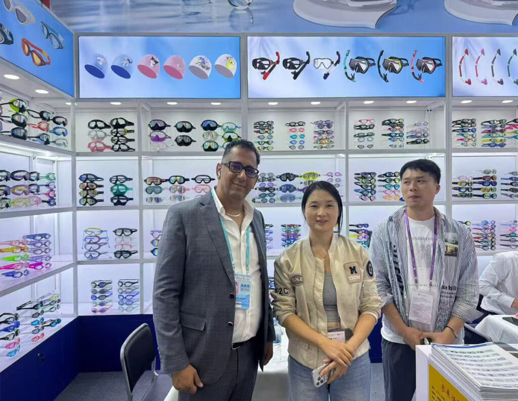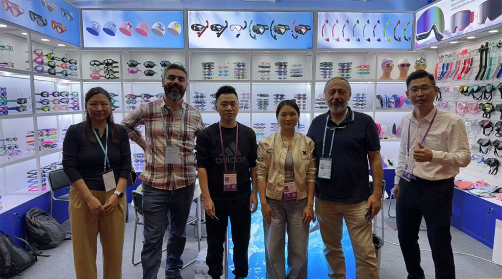 Throughout the five days, our booth welcomed a steady flow of international visitors. Buyers and brand representatives from Europe, North America, Southeast Asia, and the Middle East stopped by to explore our latest collections of swimming goggles, diving masks, ski goggles, and swimwear.